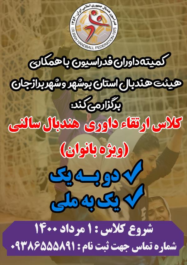 کمیته داوران فدراسیون هندبال در نظر دارد با همکاری هیئت هندبال استان بوشهر و شهر برازجان یک دوره کلاس داوری هندبال سالنی درجه یک ، یکبهملی ویژه بانوان برگزار کند.